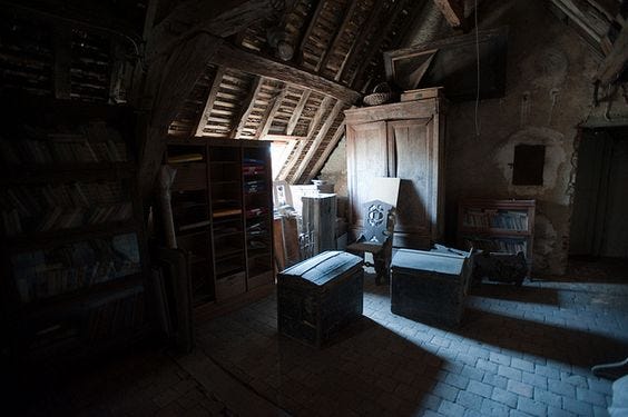 I carried her up the ladder one shaky step at a time and into the dark attic. Little bits of light streamed through cracks in the roof, just enough to be able to see some stacks of boxes and crates, piles of yellowing paper, a lampshade, and a small traveling trunk. I carefully climbed up and over the landing, cradling her in my arm. The rafters were low and I had to scoot around on my knees in the dust, making my way over to the trunk. It looked old, with leather straps and two tarnished brass buckles, and inside were more papers and an empty cigar box that someone had thrown away long ago.