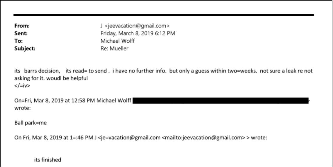 I don’t know what was sent by Epstein, or if it ever ended up on Bill Barr’s desk. I don’t know if there was ever a leak. But Michael Wolff knows, and two weeks later Robert Mueller would conclude the Russia probe.