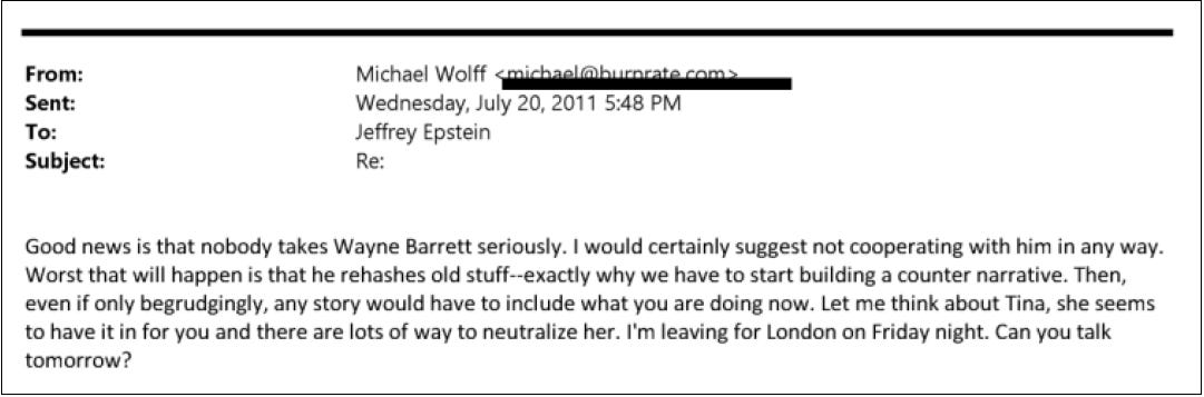 But as I read pages and pages of emails between Epstein and Wolff, organizing them into a long, chronological thread over years, I started to realize this wasn’t a business proposition; it was a friendship. And the same type of friendship Epstein had with most people—you give me something, I’ll give you something; you screw with me, and your reputation is effectively over.
